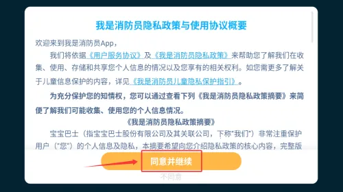 1、阅读隐私政策概要后,点击底部被红框标注的同意并继续按钮,确认进入应用。