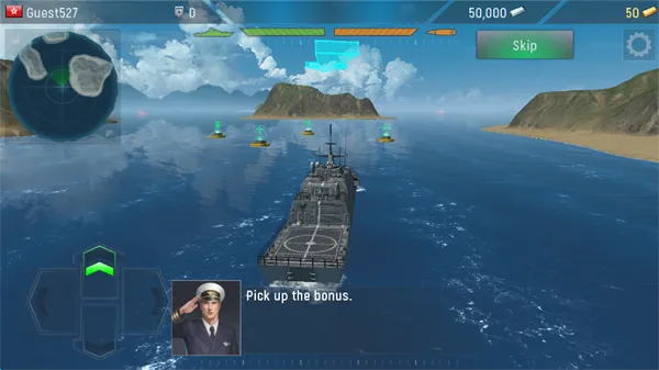 1、屏幕左下角的操控盘可以控制舰船的移动方向,前减和后退是按照档位机制的,屏幕右侧可以控制视角的移动,空中有时会掉落弹药、维修等道具。